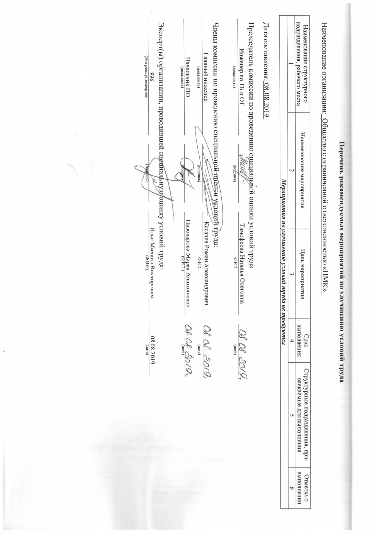 В целях реализации требований ст. 212 Трудового Кодекса РФ и в соответствии с Федеральным законом от 28 декабря 2013 г. №426-ФЗ «О специальной оценке условий труда» и на основании приказа №1 от 29.12.2018 г. в ООО «ПМК» была проведена Специальная оценка условий труда.